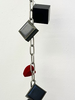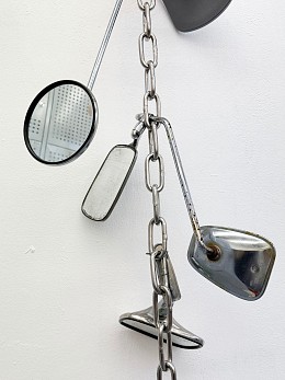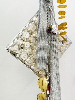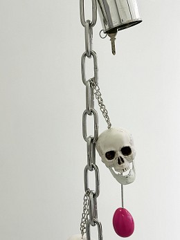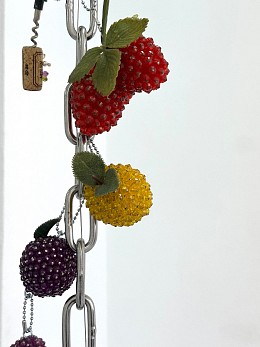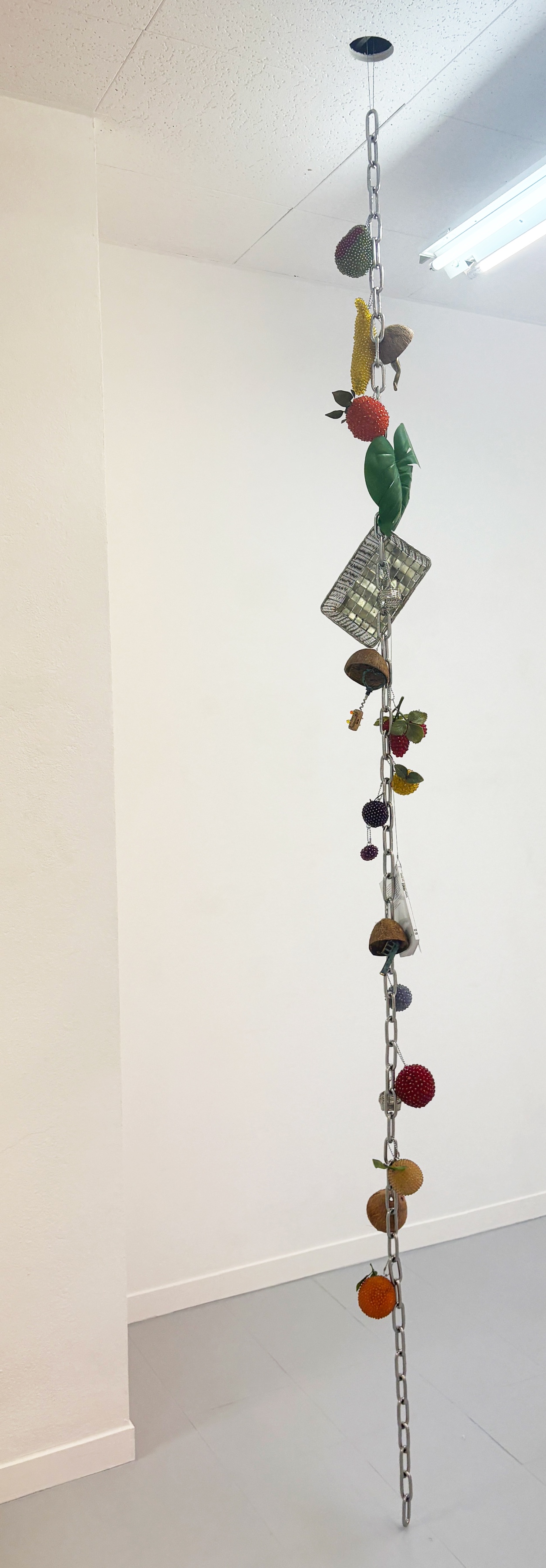 Stainless steel, found objects (bejwelled imitation fruits, coconut shells, "Les choses" by Georges Perec, silvered metal baskets, plastic leaf, bottle openers)
