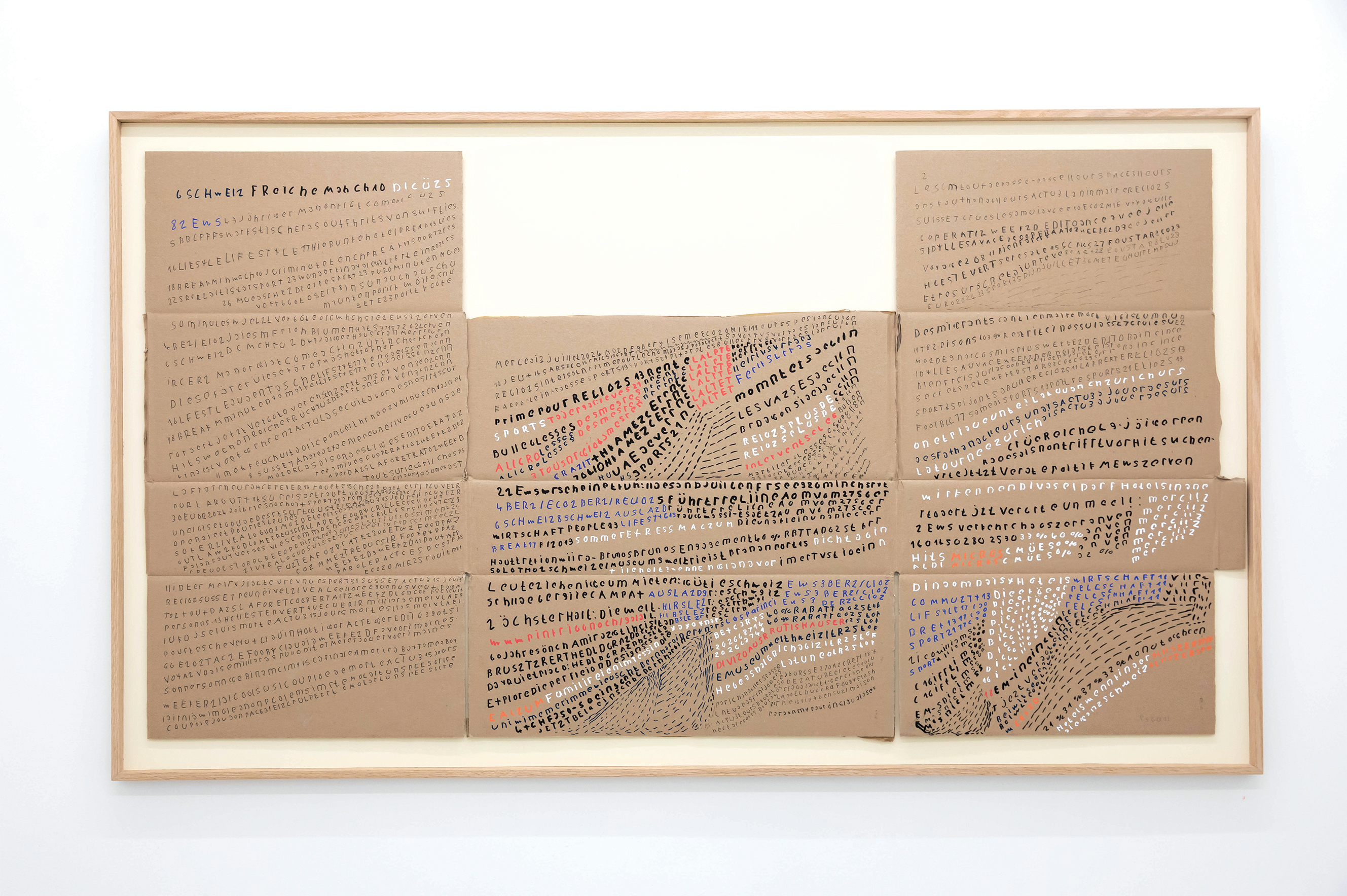 Vonlanthen has been working since 1998 at the studio Creahm in Fribourg Switzerland. Since 2014, he has drawn the raw material for his work from the texts, headlines and illustrations of local and international printed newspapers. As an illiterate person with cognitive dysfunctions, he interprets printed typography, advertisements, weather reports and other illustrations by hand. Collage and appropriation of printed newspapers have their roots in the early works of Adolf Wölfli (1864-1930) as well as in Cubist and Dadaist works. References to media by artists has been a major component of Modern and contemporary art throughout the 20th century right up to the present day. With a completely different point of view, Vonlanthen’s practice brings forward a unique counter point to this long relationship between artist and written text.