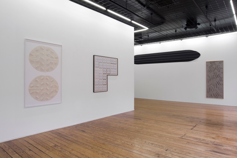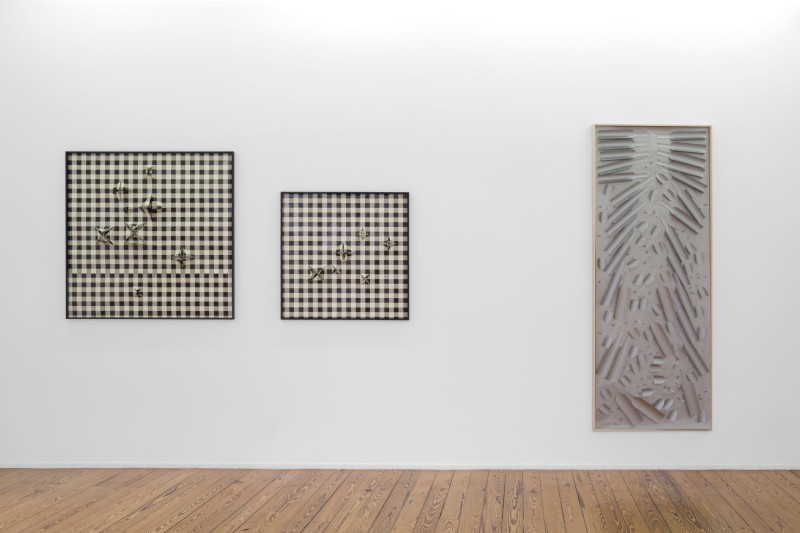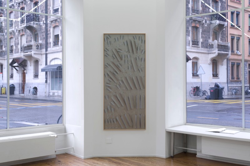 Marie Gyger’s work is distinguished by an elegance and formal refinement which functions as a veil over a contained yet smouldering critical charge. The repetitive patterns of the folds she meticulously produces both reveal and disguise. At first view, their delicate appearance discreetly wards off evidence of the anxiety-inducing traits of everyday life, yet all the while they simmer beneath the surface.