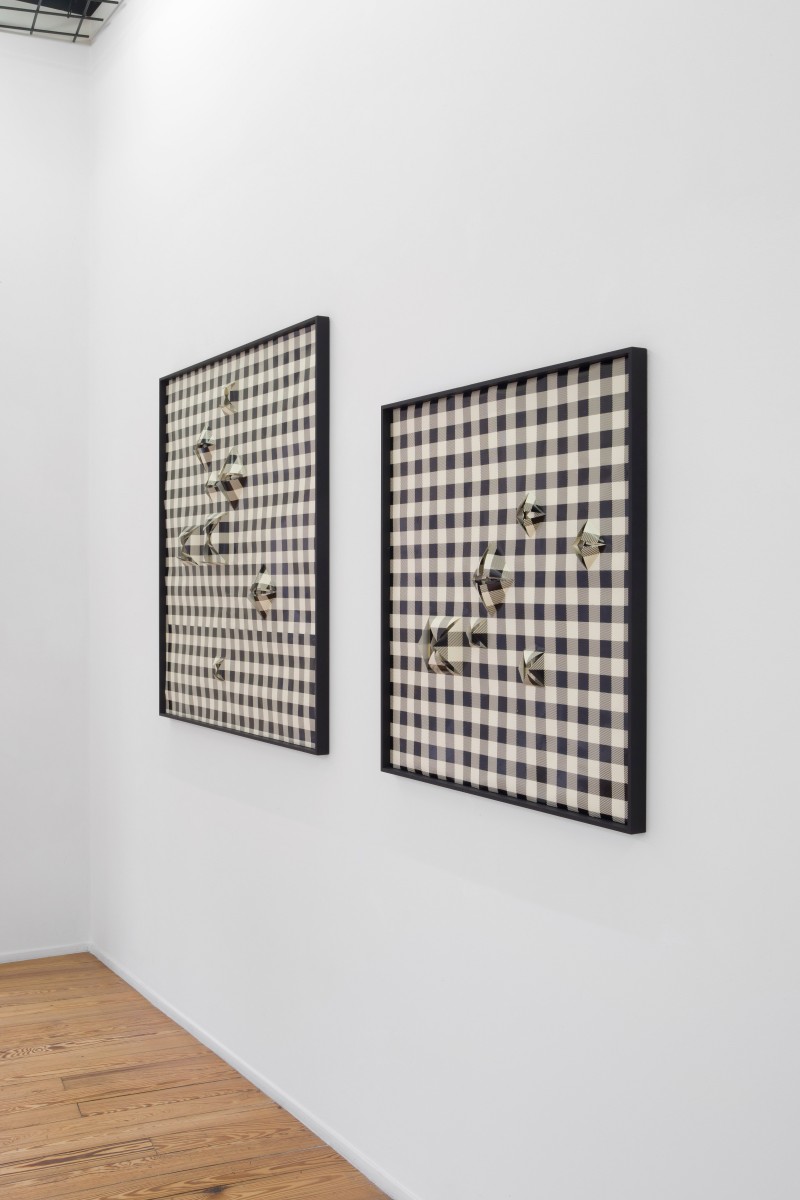 Gyger’s works are handmade, but not in the sense of craft with an emphasis on the “artist’s hand”. As if in a small factory, she works “by hand”, but in a standardized manner. Just as paper is an affordable and recyclable material, folding (Origami) is a modest technique that exists autonomously. The procedure is based on basic Euclidean geometric rules that allow to reflect upon the world in a very small scale as in a child’s game. Each form that Marie Gyger folds is measured against the paper from which it emerges and within the space that is allotted to it. Like cells halve themselves to multiply, the repetition starts with the double, one becomes two and increases by implements. The motif of the double folds itself into the work by the recurrent use of the diptych and the way she plays with double entendre.