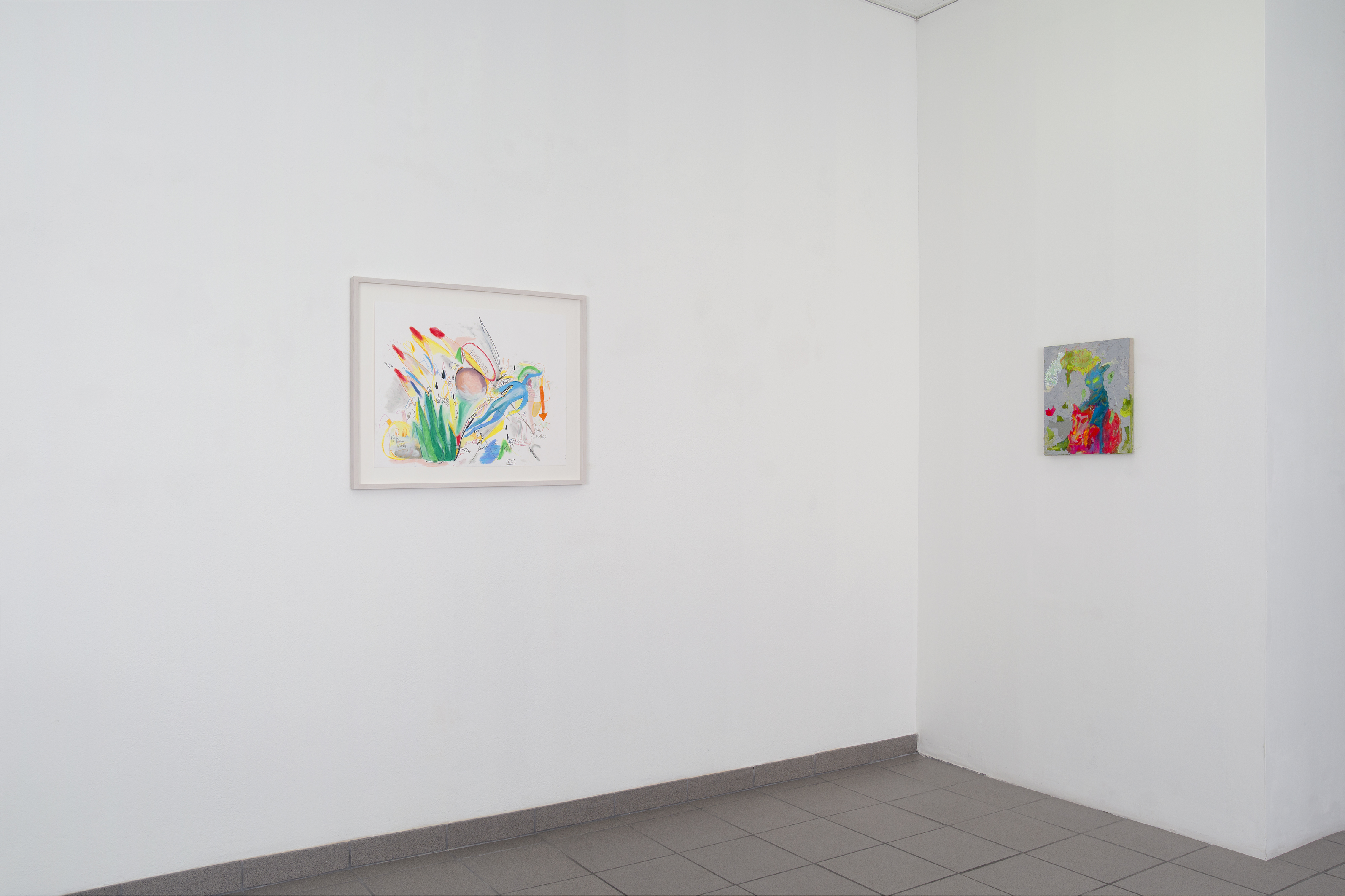 Through the lyrical use of form, language, and color, Tarek Lakhrissi (b. 1992)’s drawings evoke a sense of nostalgia connected to queer childhood experiences and its echoes. The drawings from this series develop a visual language shaped by imagined futures and shared emotional landscapes. Similarly, Audrey Ramos (b. 1998) creates dreamlike abstract paintings that merge her Peruvian heritage with her memories of growing up in the suburbs of Geneva. Her works depict repetitive or fragmented landscapes, conveying a sense of disorientation and a quest for familiarity within a cultural in-between.