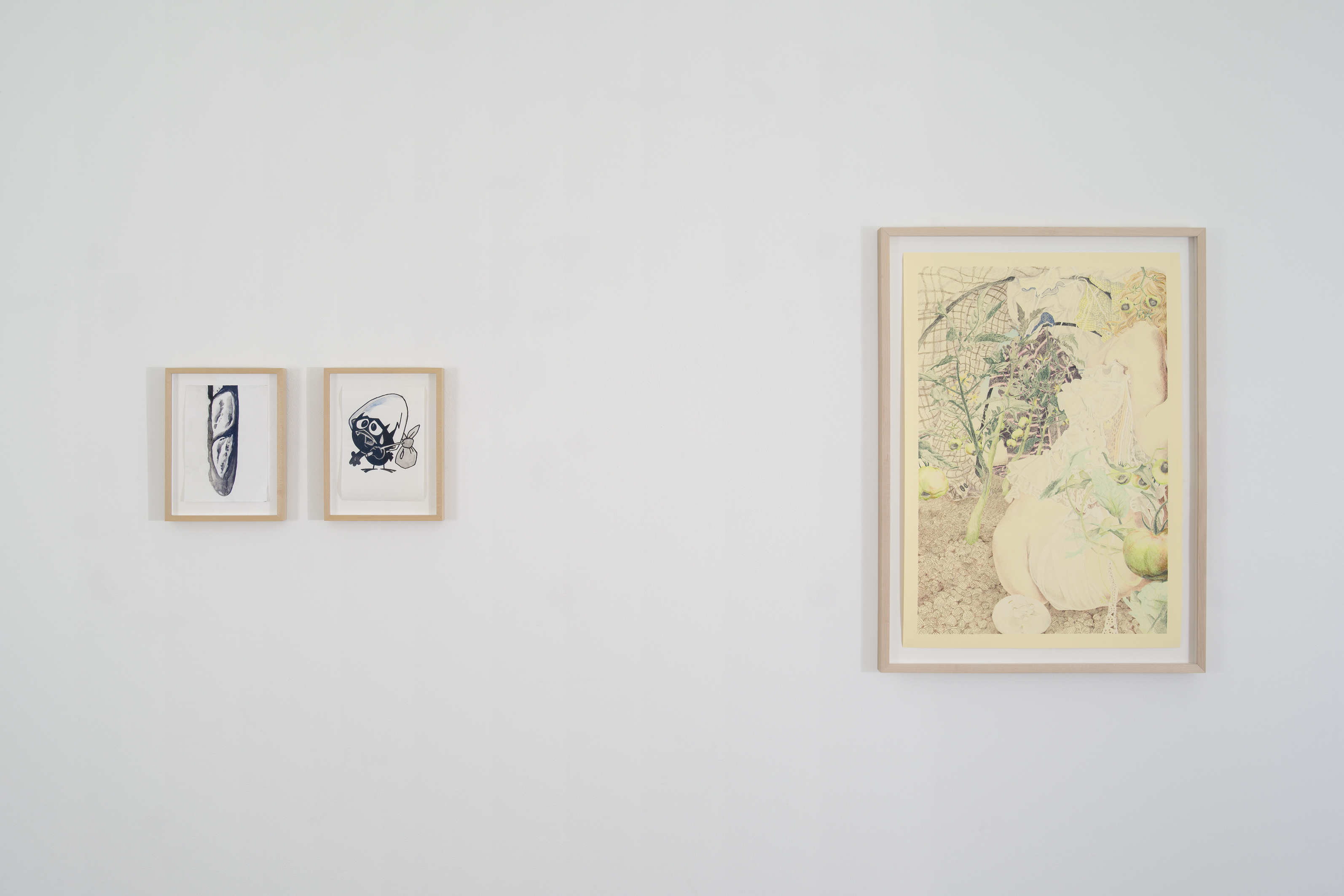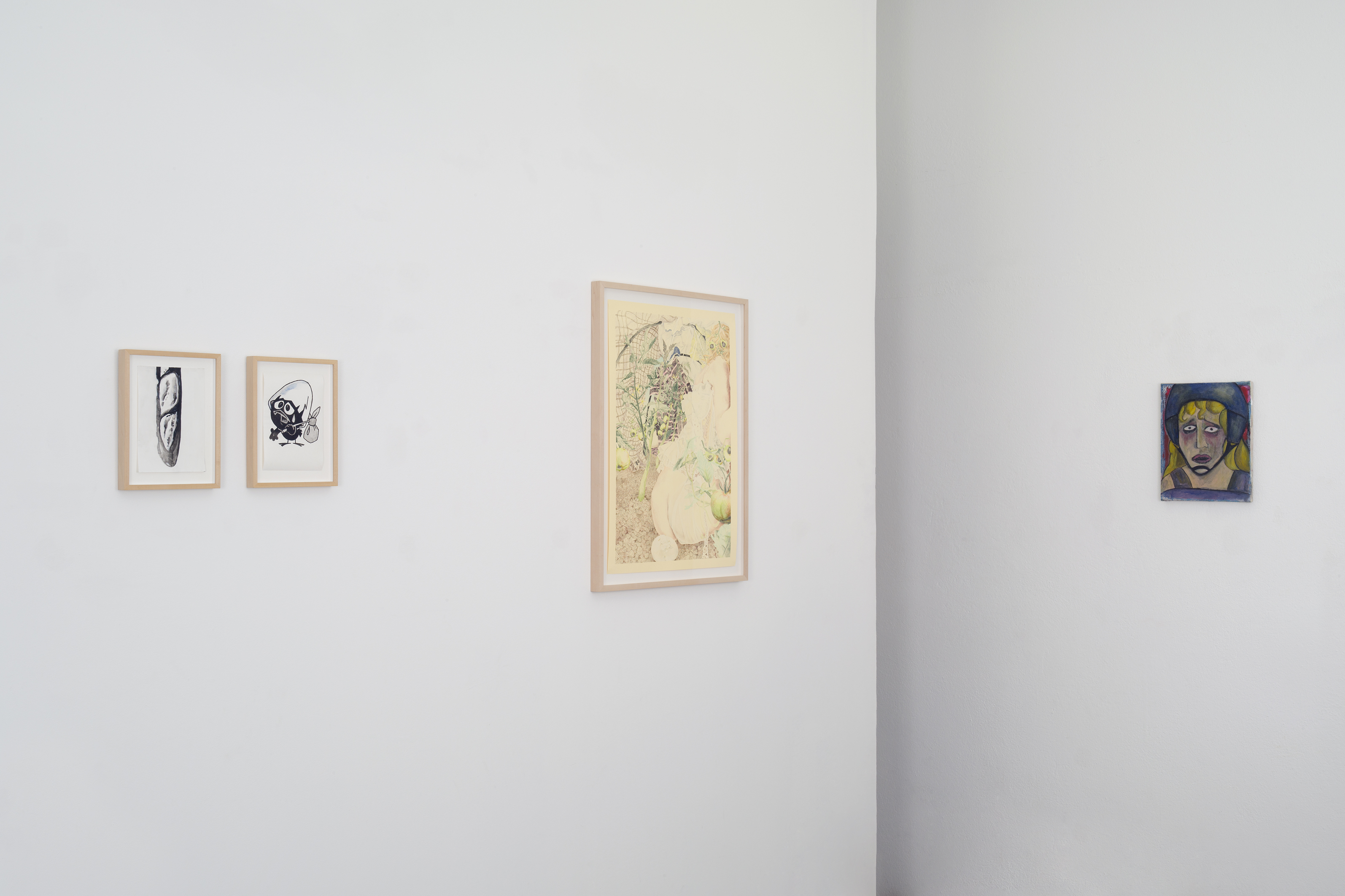 Historical works by Stéphan Landry (1960-2009) are placed in a quiet yet powerful dialogue with a new drawing created specifically for the exhibition by Italian artist Juri Bizzotto (b. 1998). Both artists navigate personal terrains shaped by queer identity, memory, and transformation. Bizzotto’s work centers on the concept of the “egg cracking”, a term used within trans communities to describe the moment of realization and self-recognition. In this metaphor, beings that hatch from eggs are born twice: once biologically and once through the act of aligning with their true selves. This sense of dual emergence resonates with Landry’s practice, where childhood imagery, melancholy, and coded references to queer life subtly unfold. Together, their works create a temporal fold–a soft space where queer memory, legacy and transformation ripple across generations.